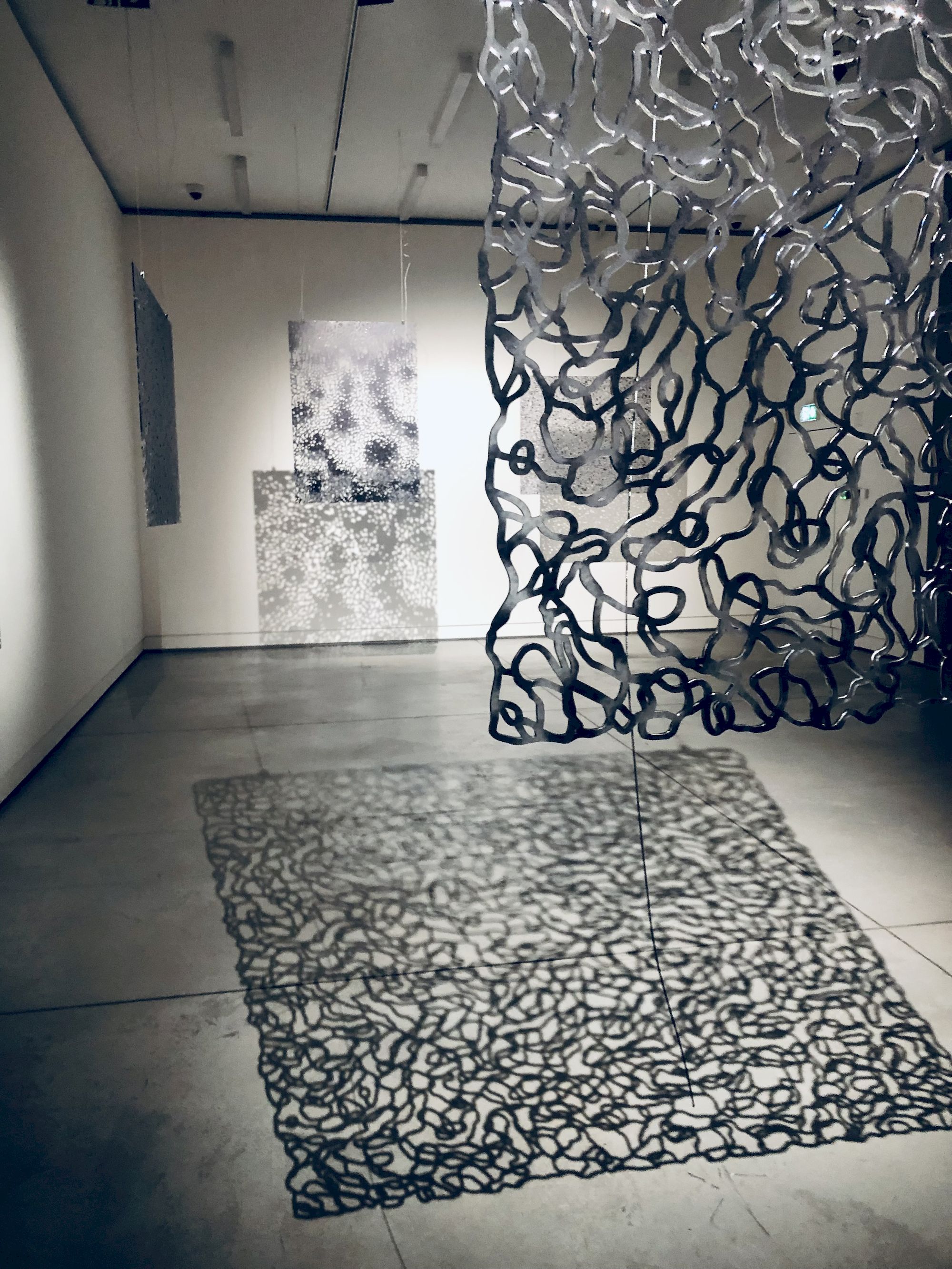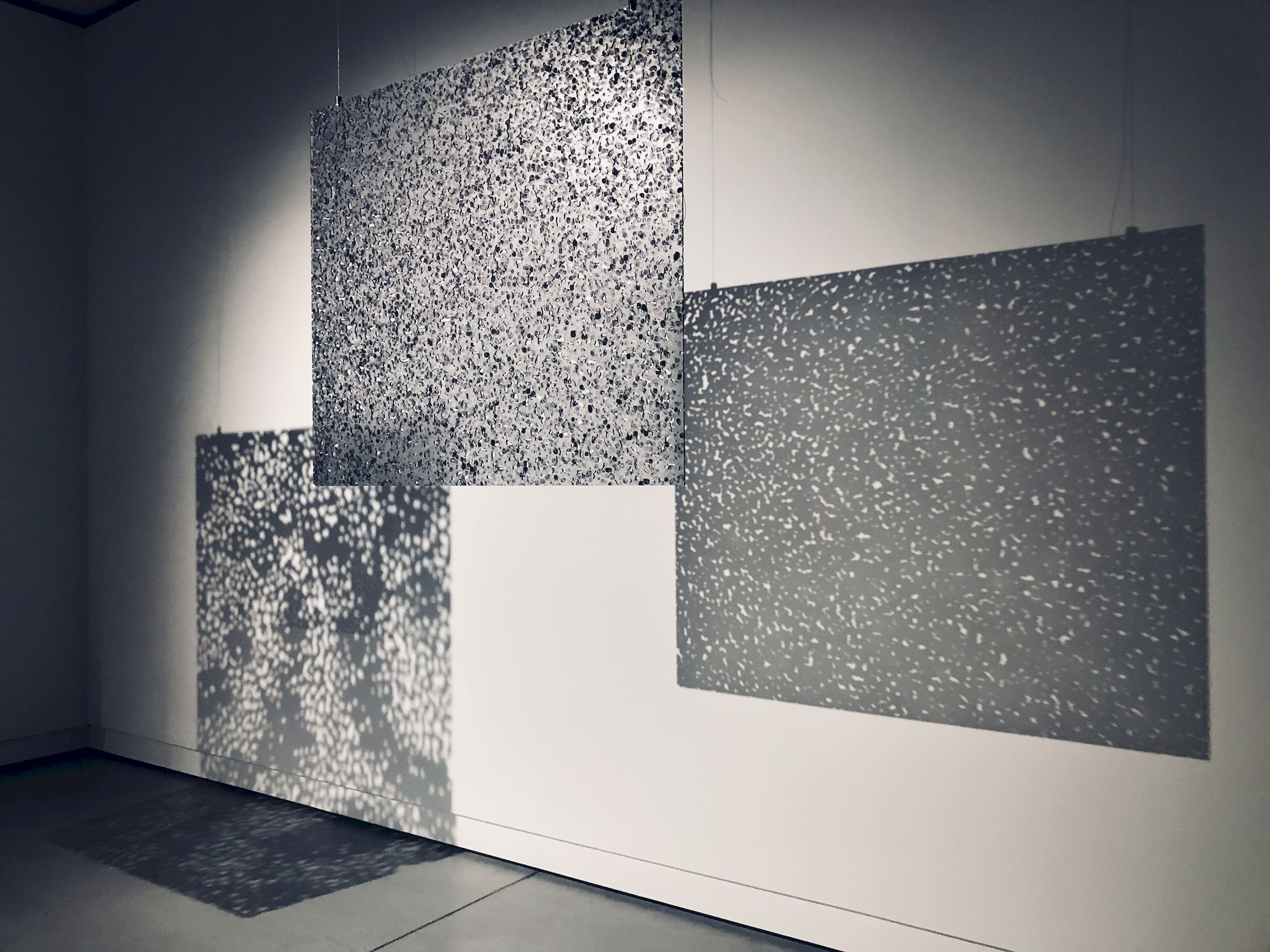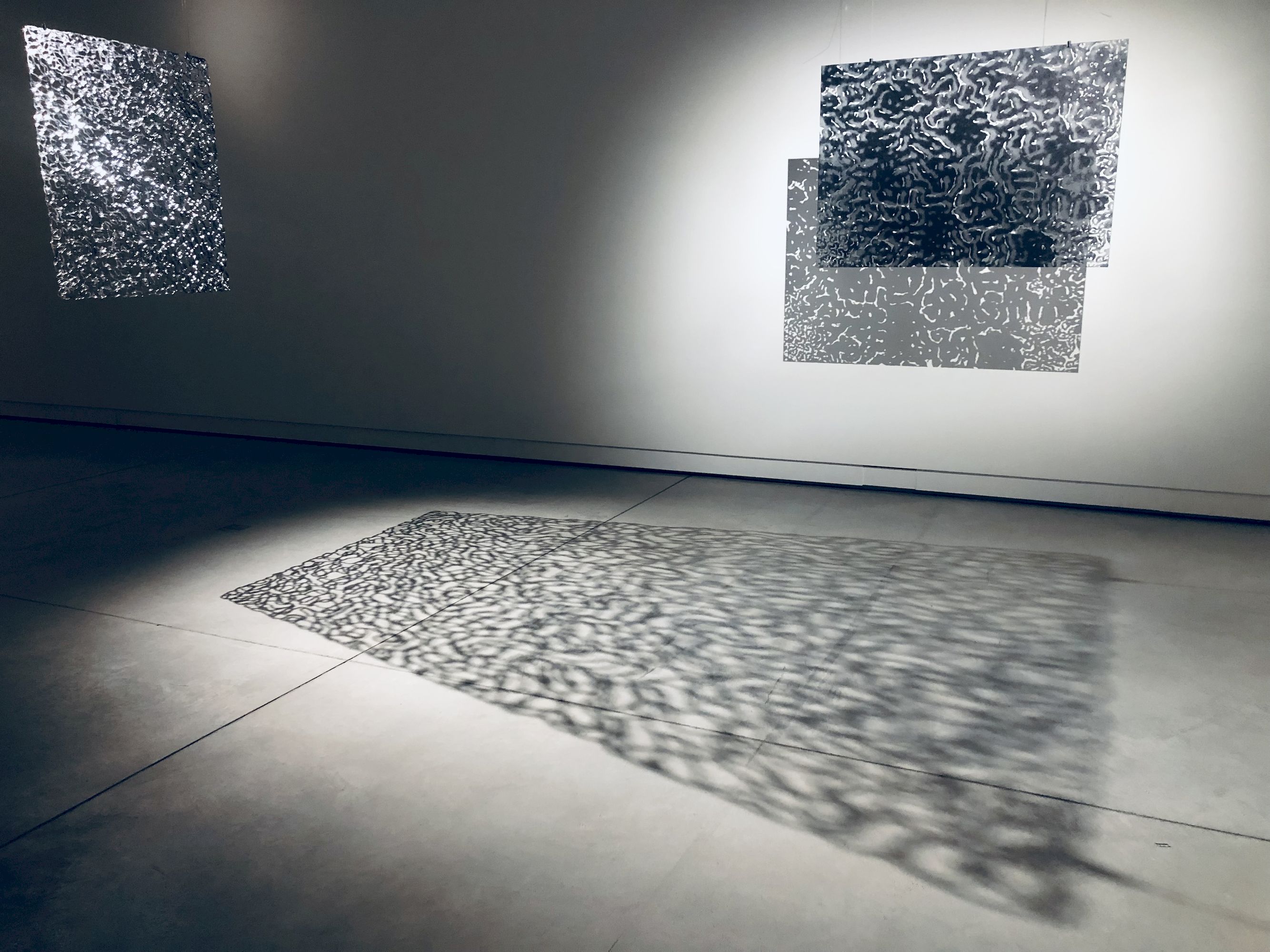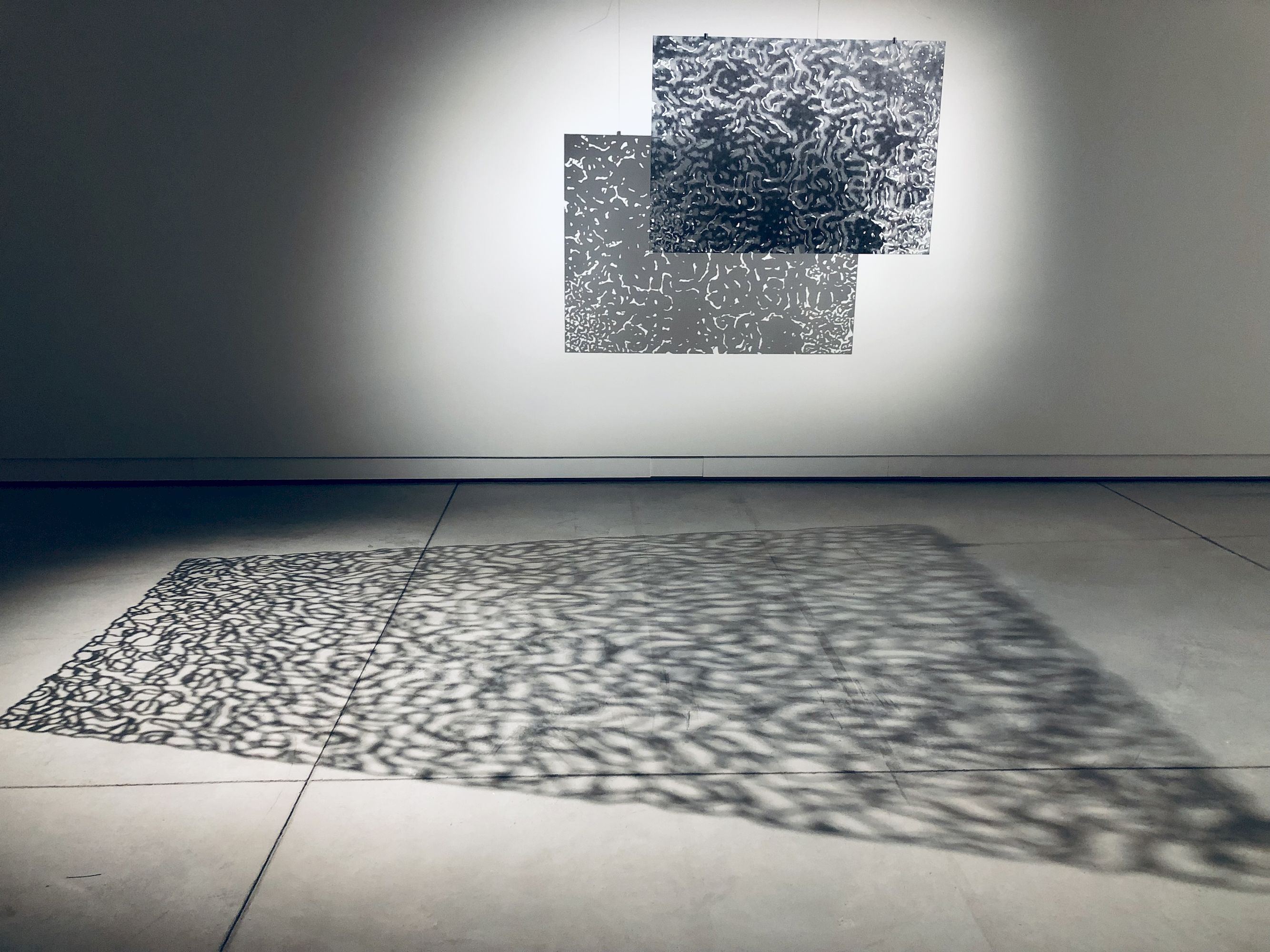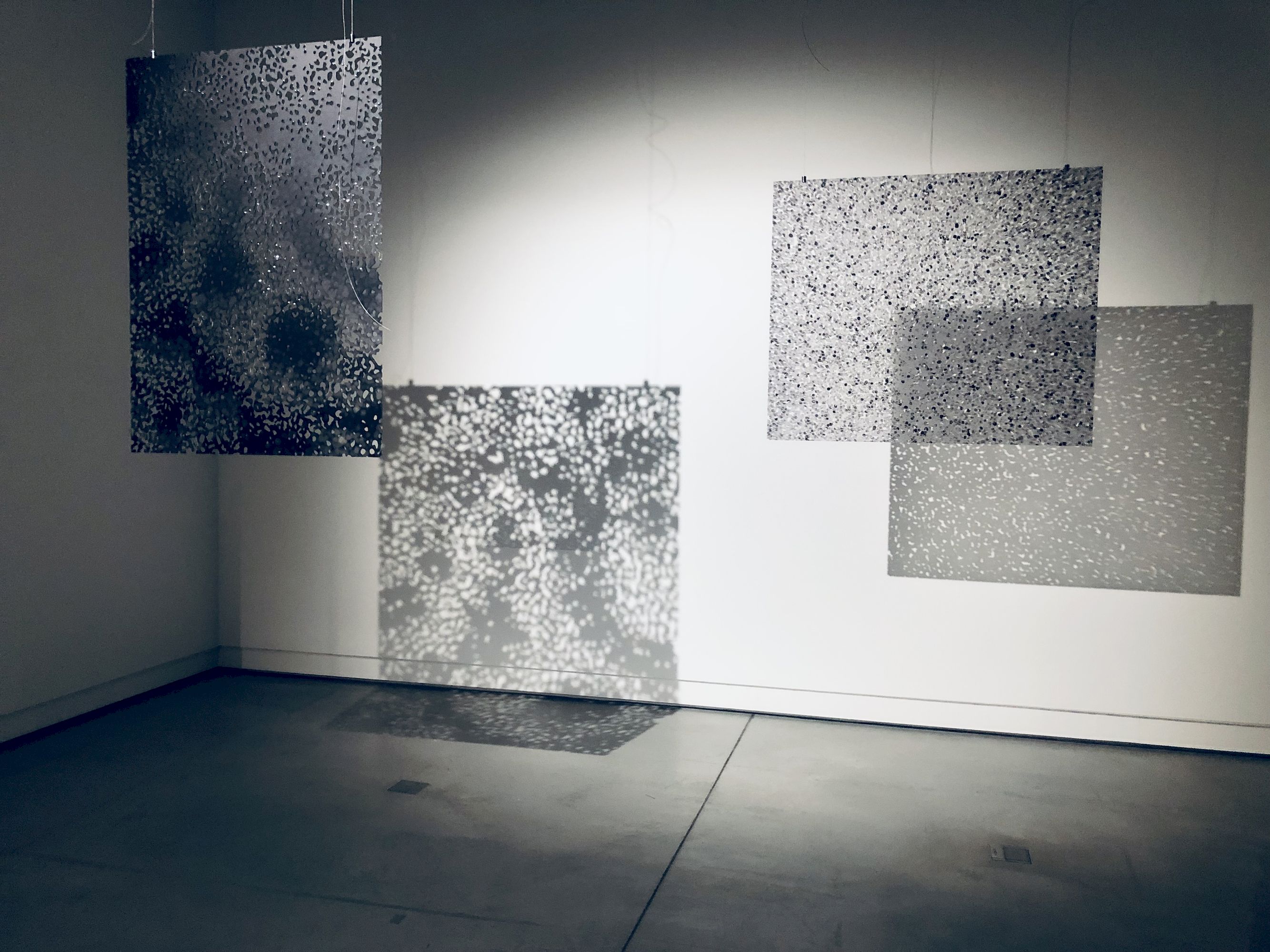 The group exhibition Extended Vision, bringing together works by twenty Slovenian artists, addresses themes of perception and seeing, optical illusions, and dispersed or sensitized perception. The light-based spatial installation Ferocrystals (2014), presented in this exhibition, consists of a series of spatial images derived from technological microscopic recordings of nanoparticles within crystallized structures of magnetic fluids. Digitally and laser-processed images of microscopic samples reveal the invisible order of material structures at the nanoscale, while, as material reproductions on plexiglass, they generate sensory, dematerialized bodies that extend into space through projections. The installation implies a moving viewer, as the surface textures shift depending on the viewing angle.