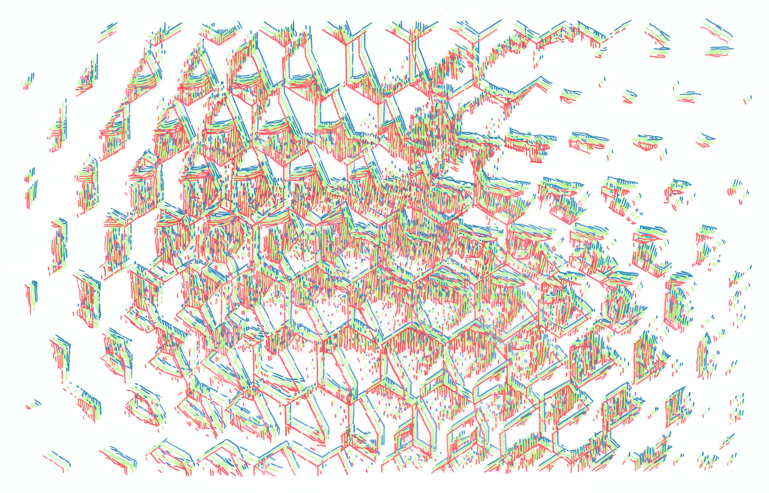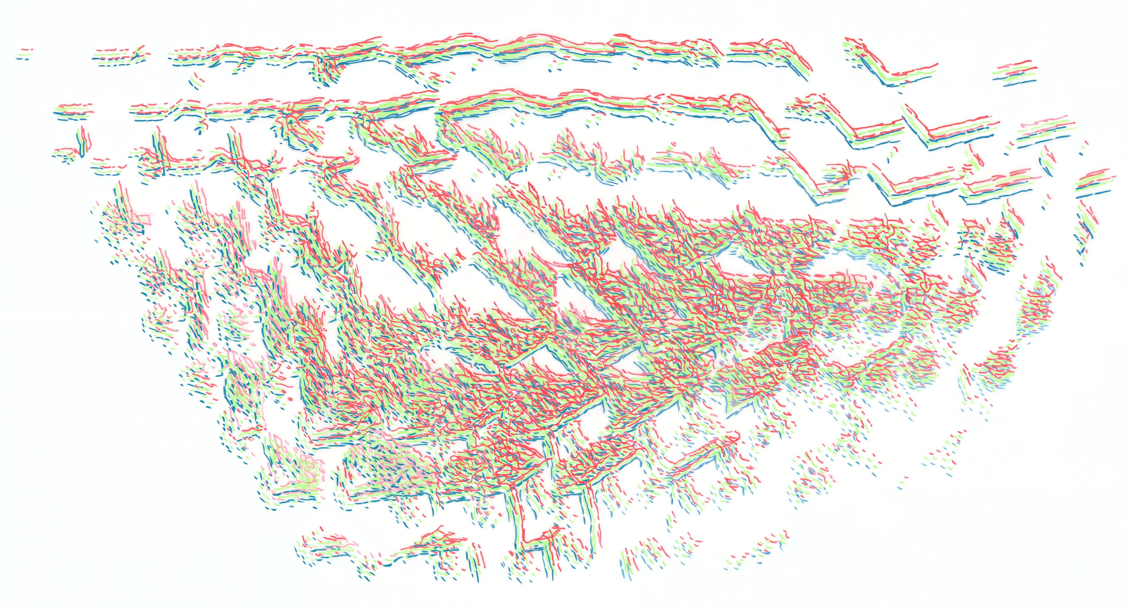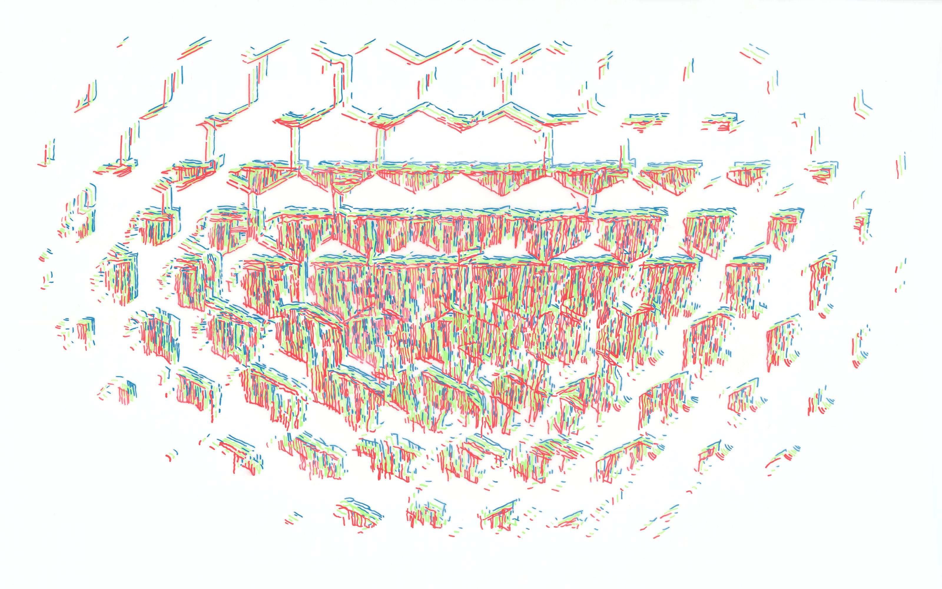 The series of five drawings RGB Frequency Levels is based on the idea that visual structures can be constructed in a way similar to scientific image analysis (e.g. in microscopy or radiology)—that is, by decomposing an image into different spatial frequencies or layers of information. The motif derives from microscopic images of materials (steel, glass, etc.) and their 3D reconstructions. These images were broken down into various levels of structural patterns and wave interferences, and then translated into a visual medium where the primary elements are color, space, shapes, and lines.