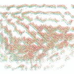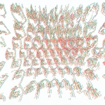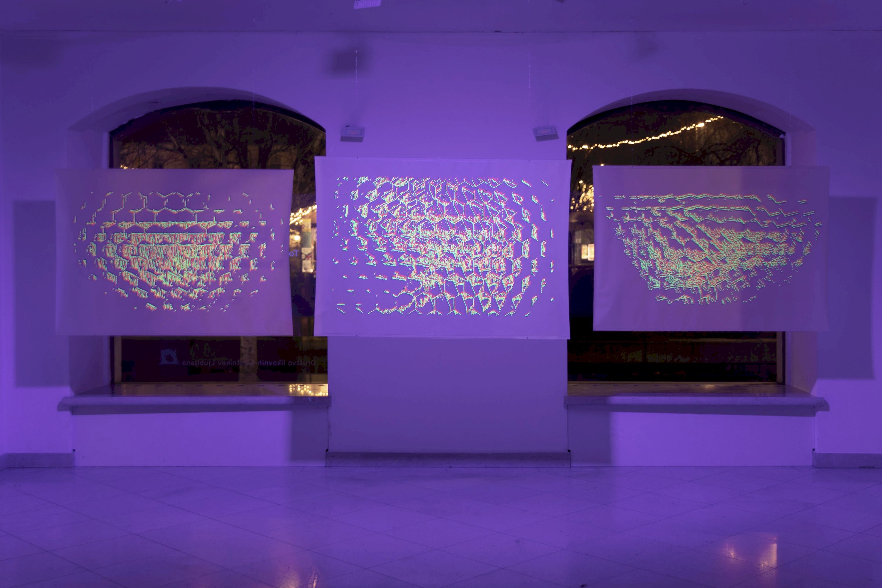 Each drawing consists of three layers, each in one of the primary RGB colors (red, green, blue). The complementary neon red and green produce strong optical effects (glow, simultaneous contrast, color vibration), while the blue layer does not glow but functions as a shadow, giving the drawing depth.