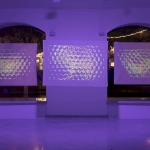 The work explores how we perceive space and matter: through color and light illusions, as well as a flickering effect, it creates a sense of movement and levitation, as if the image were attempting to detach itself from its surface.